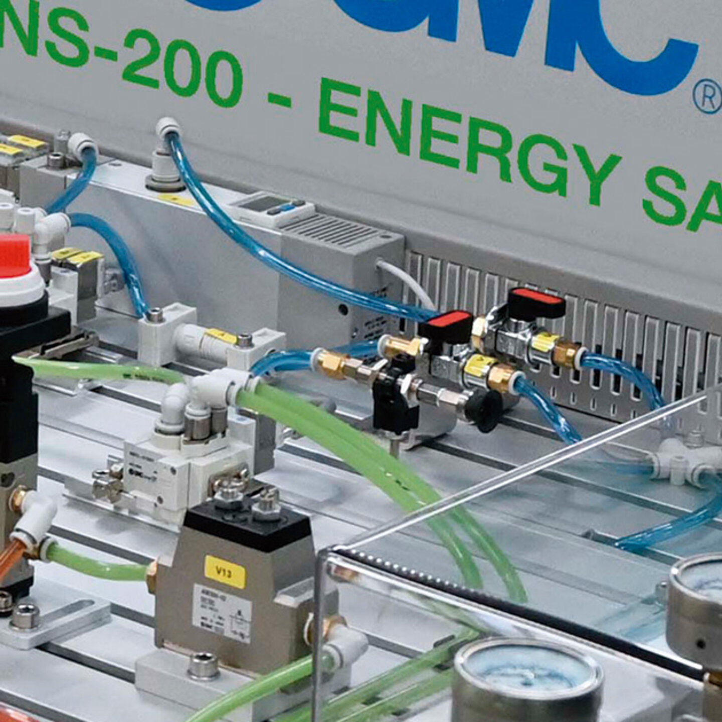The SMC ENS-200 Automation Energy Savings Trainer teaches students how to reduce cost and increase sustainable manufacturing processes ENS-200 includes an HMI (Human Machine Interface) with a built-in PLC, interactive menus guide students and technicians through the different activities.
