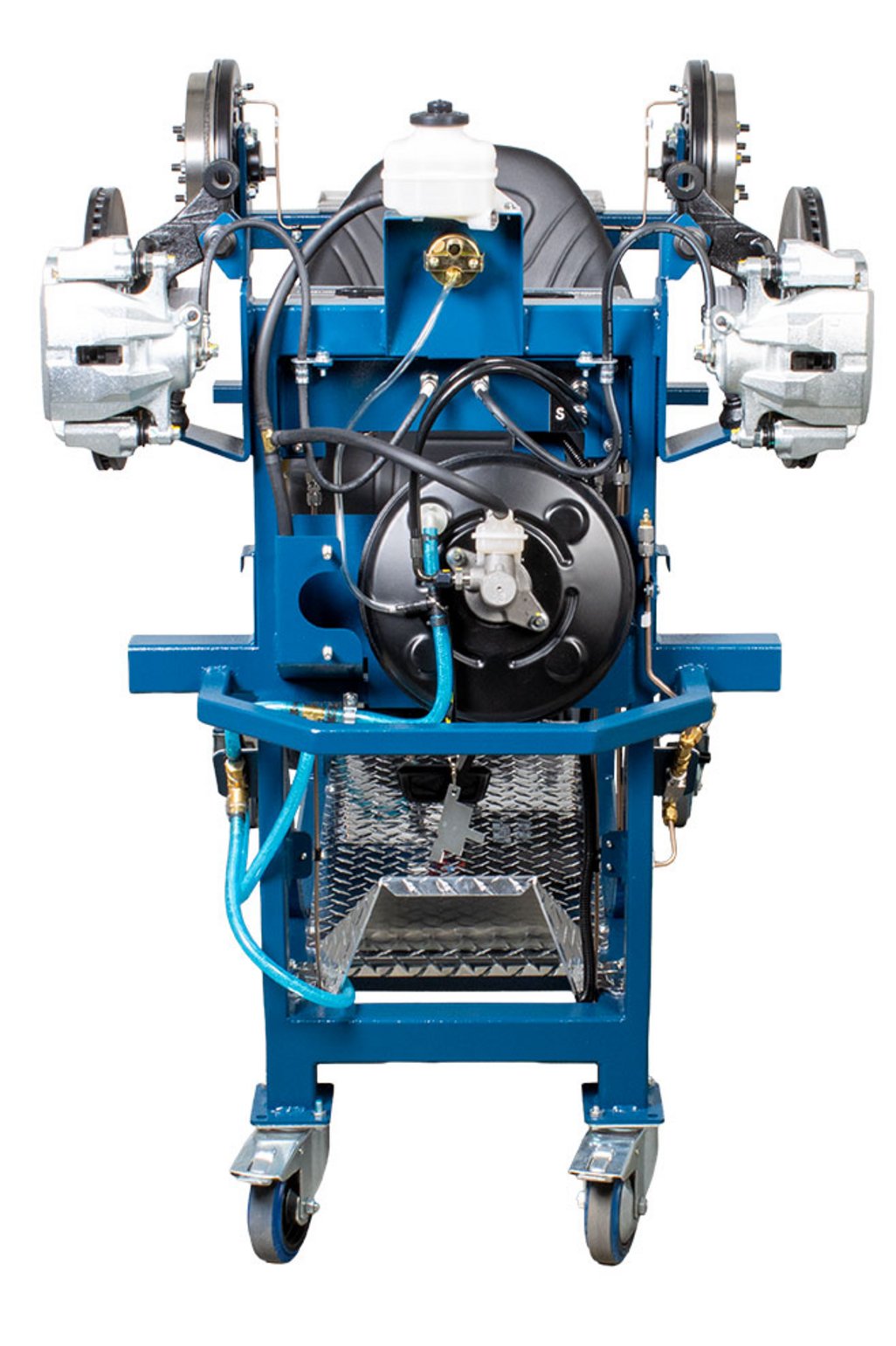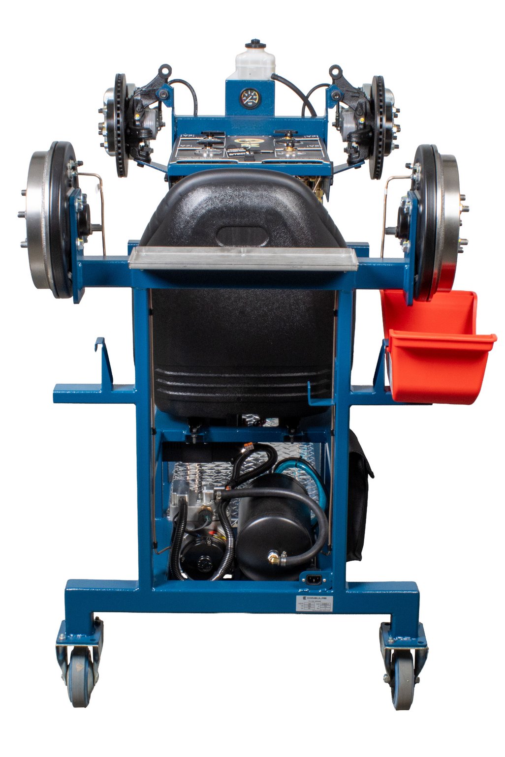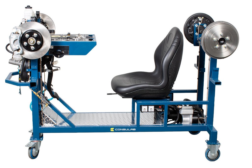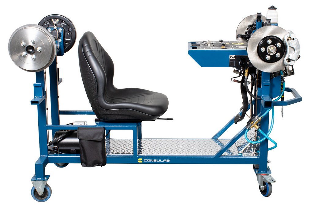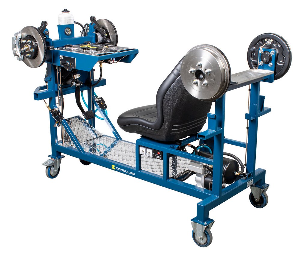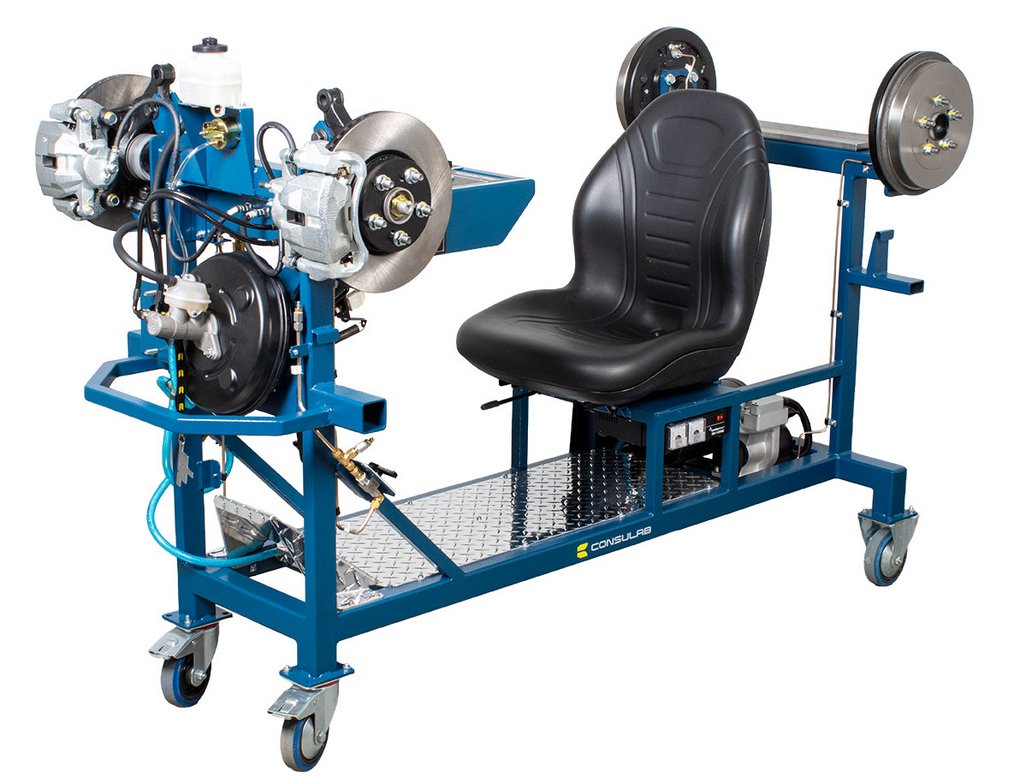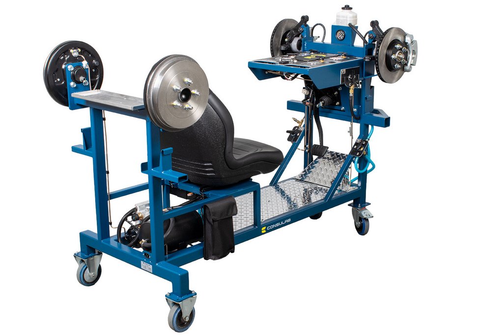 Built-in driver seat for realistic pedal feel Hydraulic pressure gauges at each wheel Four (4) hubs equipped with brakes (discs or drums) NOTE: Discs, drums, wheel cylinders, calipers, pads and master cylinder are new. All other OEM components are recycled from actual vehicles 120 VAC, 7.5 A power supply included Ability to introduce air into the system with a built-in fault and bleed the system Simulation of common problems: internal master cylinder leak, blocked or restricted hose Functional vacuum pump with adjustable restriction Non-hazardous brake fluid Sturdy powder coated metal stand with two locking swivel and two fixed casters for easy transport Trainer can fit through a standard 30” door opening |