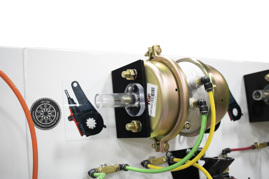 The Foundation Air Brakes Driver Training System (HV-120_052890) is an engaging and effective educational tool that demonstrates the foundational principles of air brake systems in a safe, controlled environment. This trainer allows students to visualize the operation of key components such as air reservoirs, air valves, air lines, foundation brakes, and air brake chambers, providing hands-on experience without the need for a full vehicle. By using shop air, learners can apply service and parking brakes, observe slack adjuster adjustments, and explore how air pressure affects brake performance. Ideal for driver training programs, vocational schools, and industry certification preparation, this system helps build foundational knowledge of air brake mechanics, enabling users to understand system functionality, perform inspections, and troubleshoot common issues. With its compact design and intuitive setup, the trainer facilitates interactive learning, making complex concepts accessible and promoting confidence in air brake operation and maintenance.