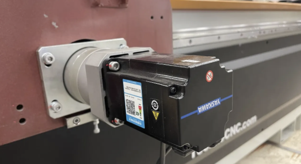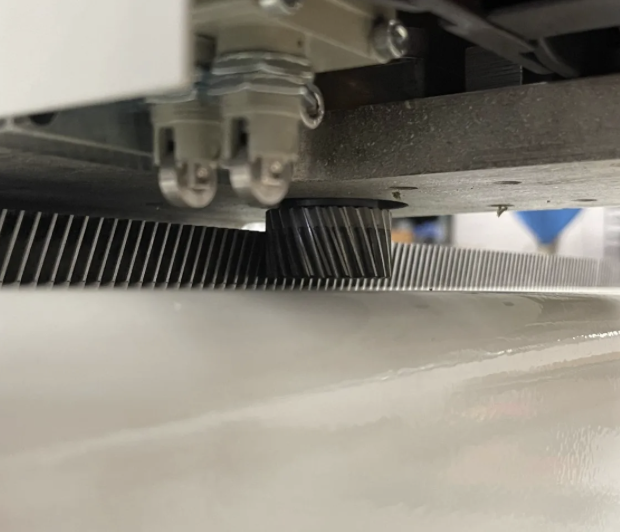 Drive Train Assembly Precision helical gear racks on X/Y axes; inverted rack mounting prevents dust buildup for smooth motion and reliability; precision gearbox directly coupled to servo motor and pinion (eliminates belt stretch for high-speed accuracy); superior to ball screws in large-format machines for speed, accuracy, and longevity.