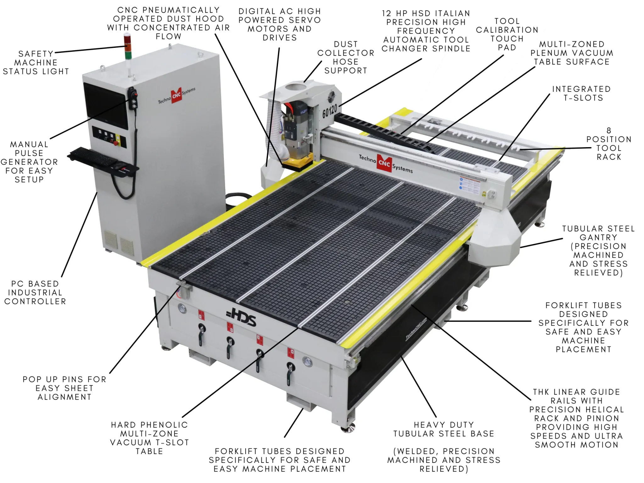 The HDS Series CNC Router is constructed entirely of steel, providing a rigid foundation required for ultra-smooth routing results. The HDS Series CNC Router includes a 12 HP HSD automatic tool changer spindle with an 8-position tool rack, and comes standard with a pneumatically operated dust collection hood that concentrates air flow at the cutter, providing optimal dust collection performance. The multi-zone vacuum T-slot table is constructed from very hard Phenolic—an extremely stable material that holds tight tolerances for precision cutting. This CNC machine is connected to a 10HP rotary vane vacuum pump (twin pack optional), for quiet operation. For easy sheet alignment, (3) pop-up pins are included on the HDS Series, and are precisely placed to handle and align various size materials. The HDS Series CNC Router is powered by brushless AC Servo digital motors and drives, and is powered by an easy-to-use and learn Osai PC based industrial controller.