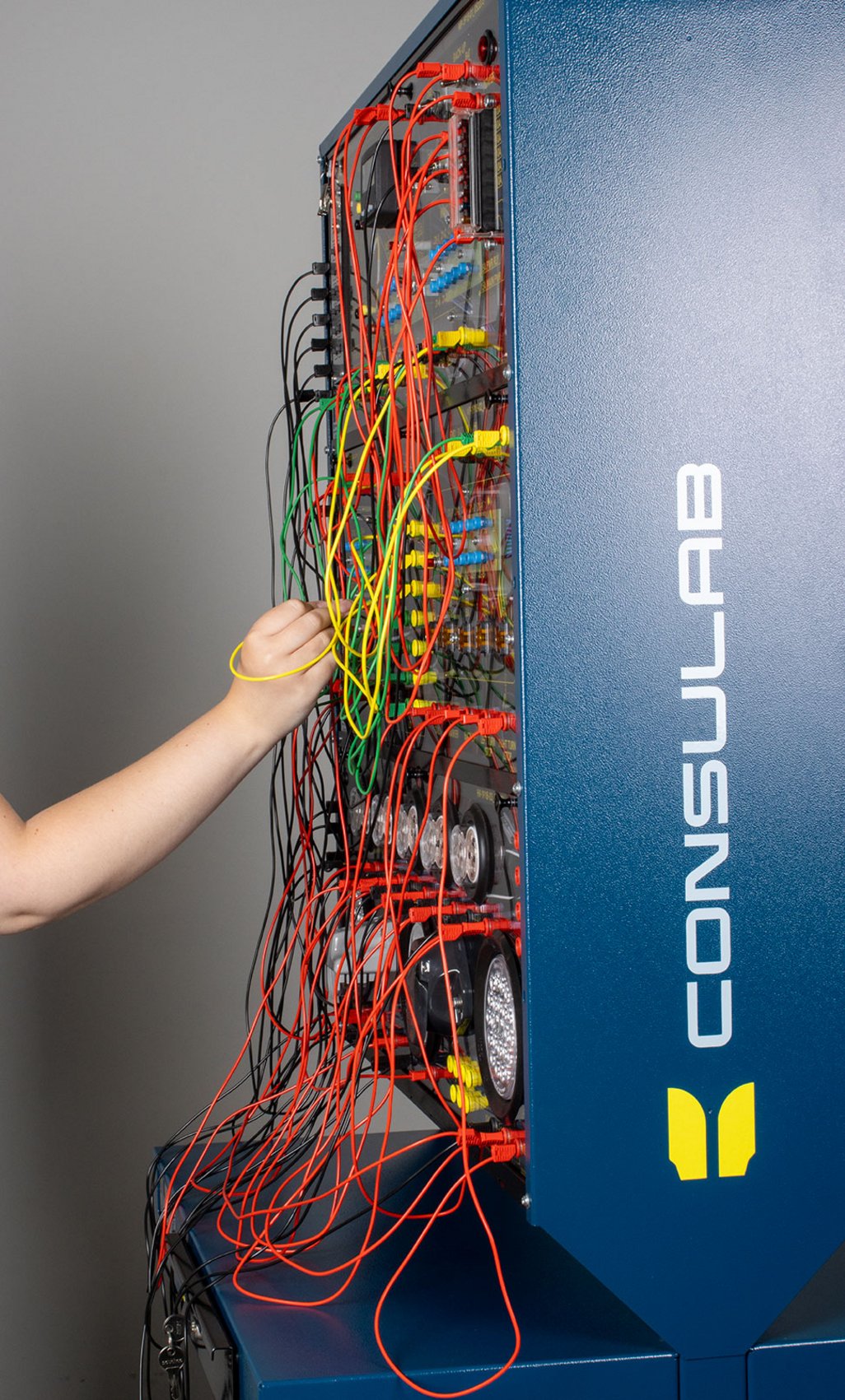 The ConsuLab HV-1918-1D Double-sided Heavy Vehicle Lighting System Trainer utilizes the “Moduponent™” design feature which allows unlimited expansion capabilities. A Moduponent™ consists of a clear Plexiglas sheet with components, wiring and socket test points attached. The Moduponent™ is attached to the trainer using disconnect fasteners which allows easy adaptation and configuration for different applications.