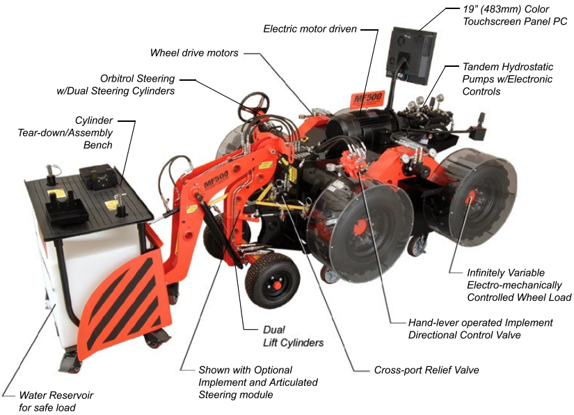 The MF500 is designed for instructors who want to teach hydrostatic transmission and steering systems from basic concepts to advanced applications and troubleshooting with the same components found in popular front-end loaders, but without the safety hazards and physical limitations of operating a loaded, faulty skidsteer in a shop full of students. And while industrial skidsteers are designed for one occupant, the simulation software allows you to have students gather around to see real-time symptoms of faults as you drive the simulator through a variety of scenarios. The MF500 is available with the optional MF500-IS-TSE Hydraulic Implement and Articulated Steering System Module (pictured here).
