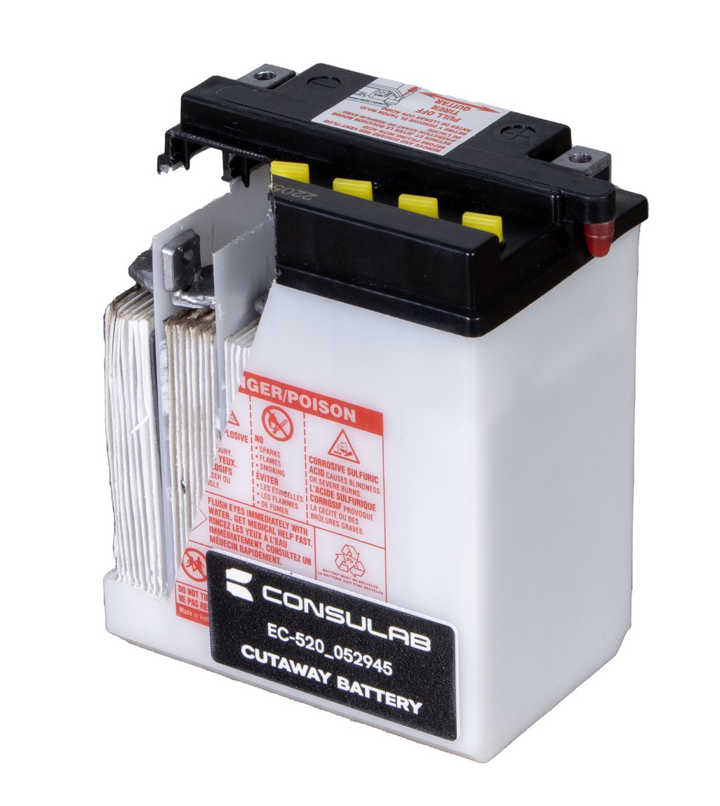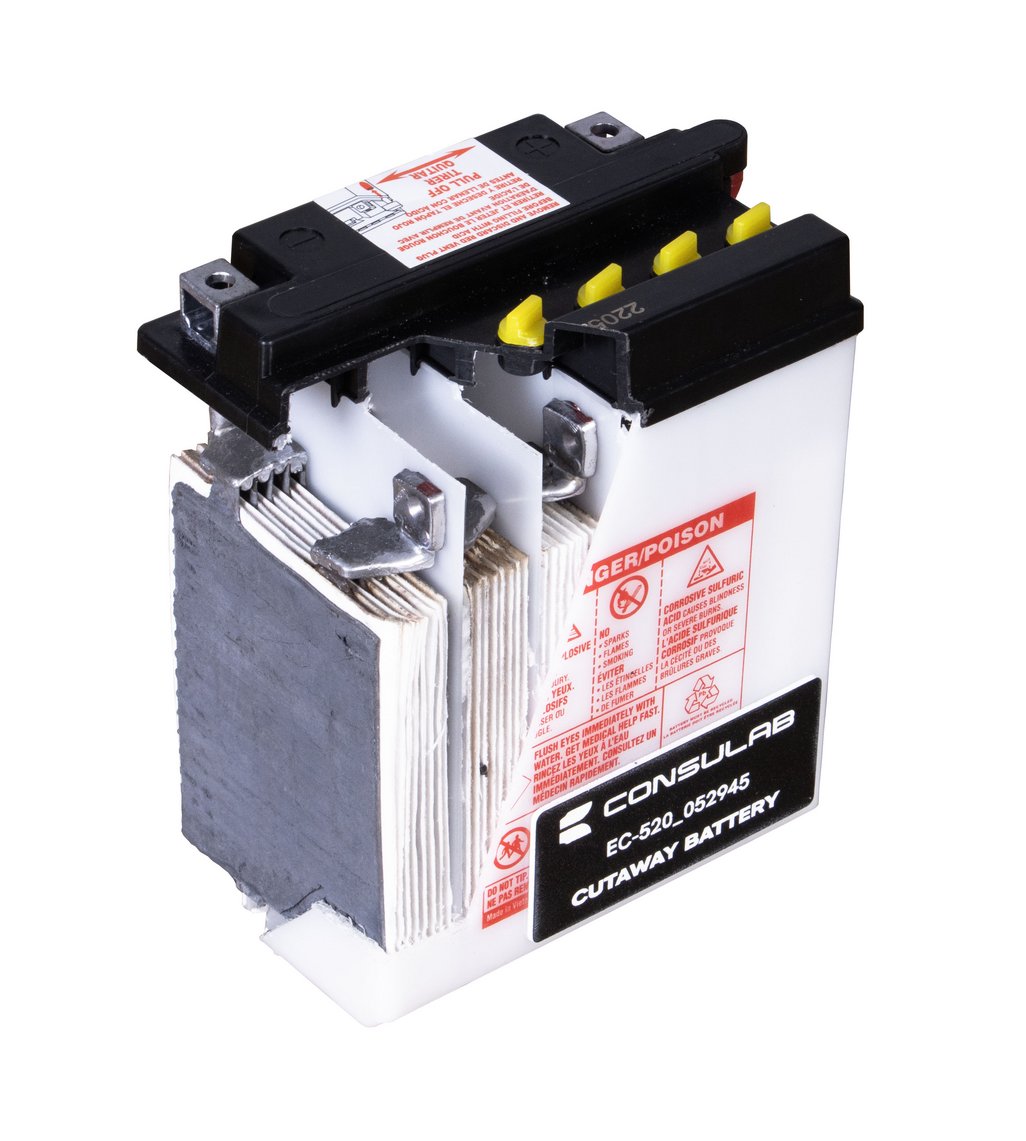 The Lead-Acid Battery Cutaway Trainer (EC-520_052945) is the ideal aid for teaching battery principles and allows visualization of the inner parts, providing a clear view of internal components without electrolyte for educational purposes.