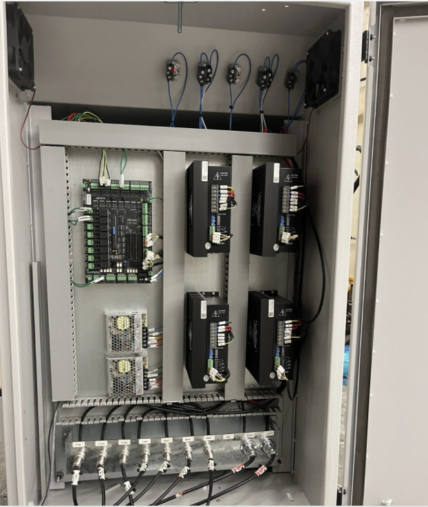 Electronics All the electrical components are housed and wired in a doubled-doored Nema 4 electrical enclosure. This allows for easy access and service when needed. All wiring is tagged so that when service is required, the customer can easily navigate the cabinet. In addition, the cabinet serves as a work bench for the tools required the program.