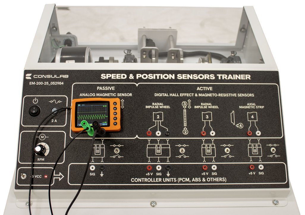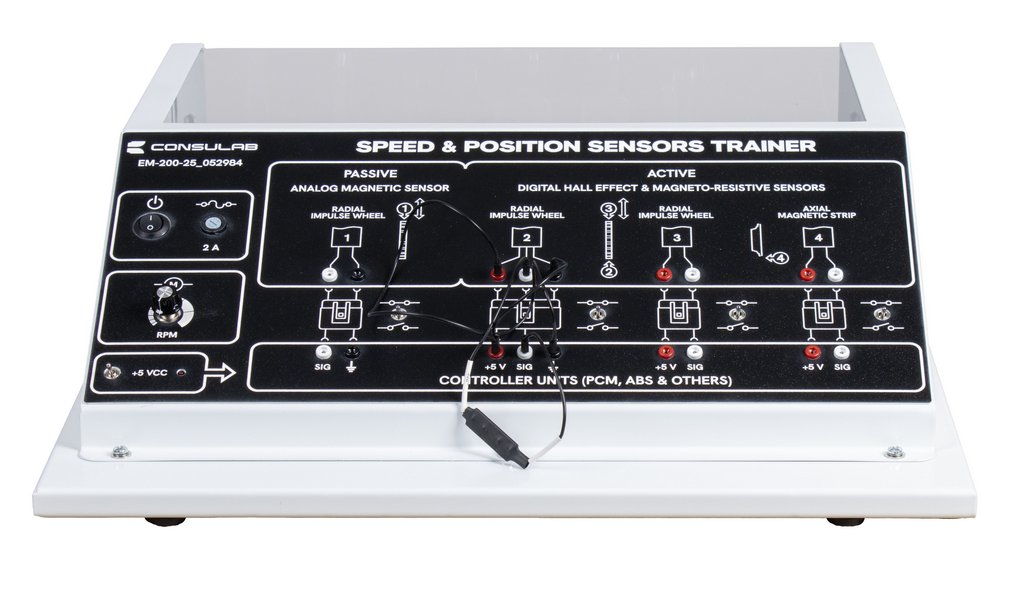 The Speed + Position Sensors Training System (EM-200-25_052984) is an innovative educational tool designed to demonstrate the operation, diagnosis, and testing of common types of analog and digital speed and position sensors in a single, accessible setup. This trainer offers a safe and effective way to showcase the operating principles of various speed and position sensors commonly found in today’s cars and trucks, typically used for applications such as wheel speed, engine speed, and vehicle speed. With its benchtop design, students can clearly visualize sensor operation, make adjustments, and perform diagnostics and testing, all supported by an electronically controlled variable speed electric drive motor for realistic simulations from zero RPM through variable speeds.