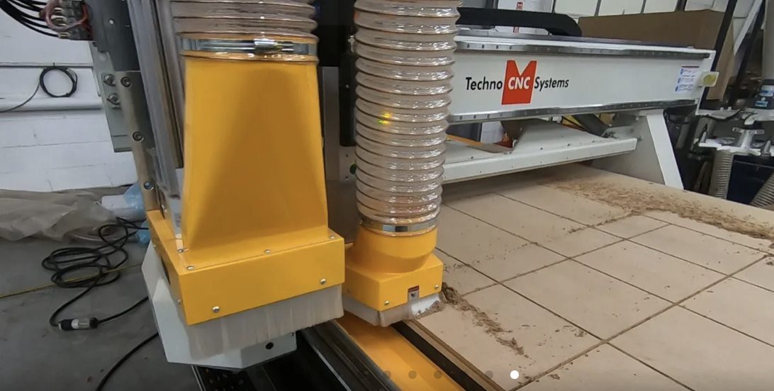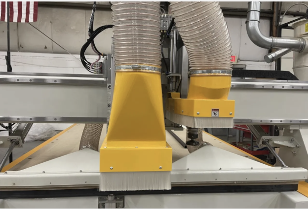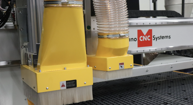 Vacuum Shroud The Venture Cabinet Nesting Machine includes a pneumatically operated vacuum hood that has concentrated air flow at the spindle thus efficiently cleaning up the dust and debris as it is routed.