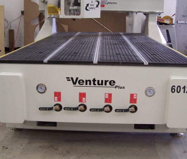 Vacuum Table The Techno Venture Plus CNC Router has a 1 inch thick phenolic vacuum table surface mounted onto the steel base frame, keeping a rigid and consistent platform for sheets and parts to be supported. The vacuum plenum table surface is multi-zoned which allows the operator to easily switch from full sheet processing to smaller part processing, (which requires a smaller segmented area). Zones can be turned off easily via control valves on the front of the machine. Gasketing can also be routed to accommodate various material sizes and styles.