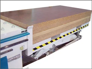 REAR SCISSOR LIFT The automation work cell includes a rear scissor lift which supports and raises the stack of material to the machine’s vacuum bed height, which is monitored with optical eye-sensing stack material height and machine bed surface.