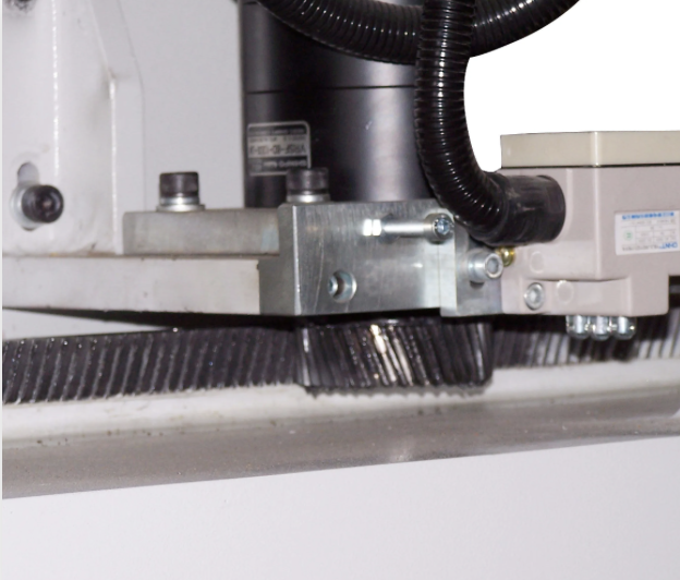 Drive Train Assembly This CNC Router uses precision helical gear racks on the X and Y axes. The mounting of the rack is inverted to help keep dust and debris from building up on the drive system, this assures smooth play-free motion and long term reliability. The precision gearbox is directly coupled to the drive motor and pinion. This eliminates belt stretch inaccuracies assuring high-speed machining while the system positions the spindle accurately.