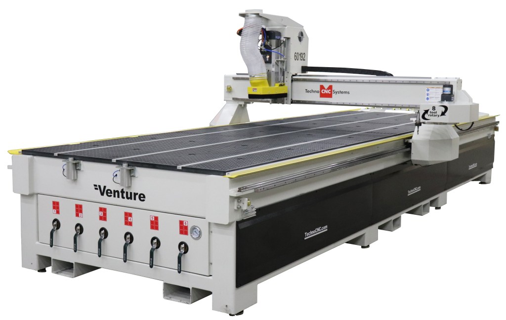 The Venture Series CNC Router was specifically designed for high volume production shops. Features for the Venture Series CNC router include all steel construction, precision linear rails and bearings, and precision helical rack-n-pinion on the X and Y axes with a ballscrew Z axis drive. The Venture series comes standard with a PC based Osai industrial CNC controller with an easy to use system interface, and a 12 HP HSD high frequency automatic tool changer, that comes complete with a pneumatically retractable vacuum hood and multi-zone vacuum T-slot table. The XY drives include a precision gear box that is directly coupled to the servo motor and pinion. This provides high speed precision motion. All of the electronic components in the Venture Series CNC Router are housed in the NEMA double-door cabinet, which allows for easy access. This engineered masterpiece is the result of years of experience in the CNC router market.